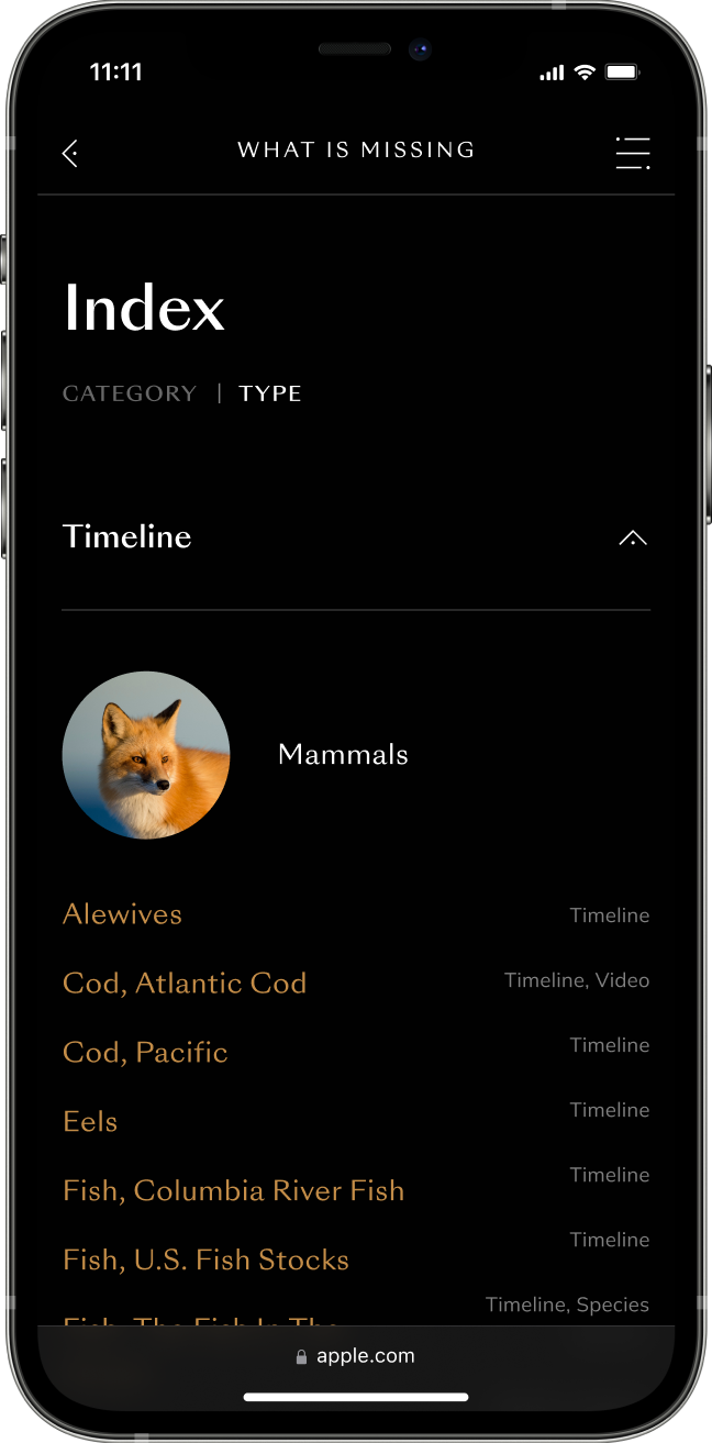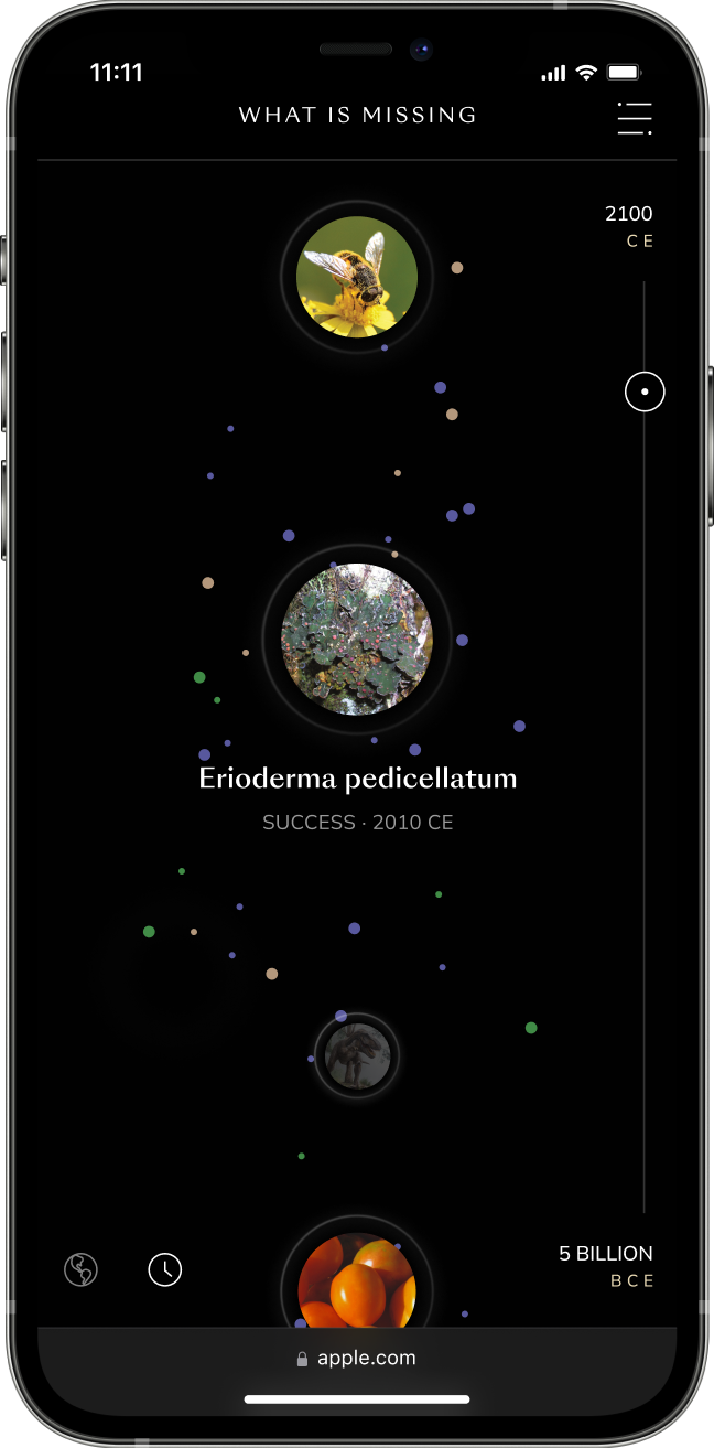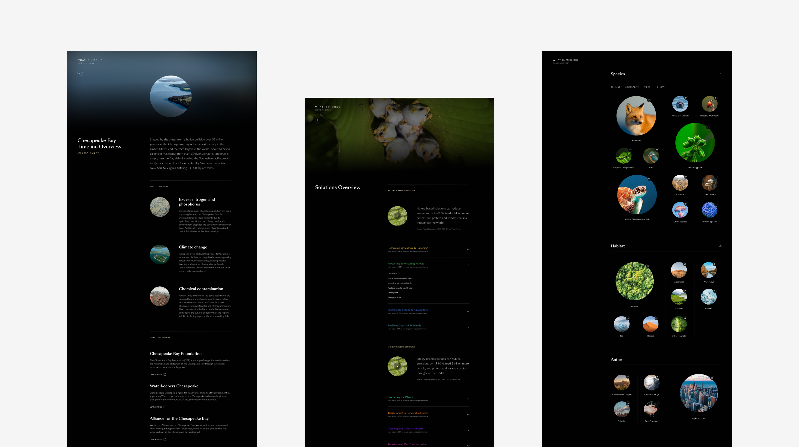what is missing? is the fifth and final memorial created by maya lin to raise awareness around the human impact on our planet, and what we can do to reverse the path we are on. the site encourages users to explore a global map of memory in an interactive world or timeline view. encompassing the full range of earth's existence it scales elegantly to show the vast amount of data and content that tells its rich history.